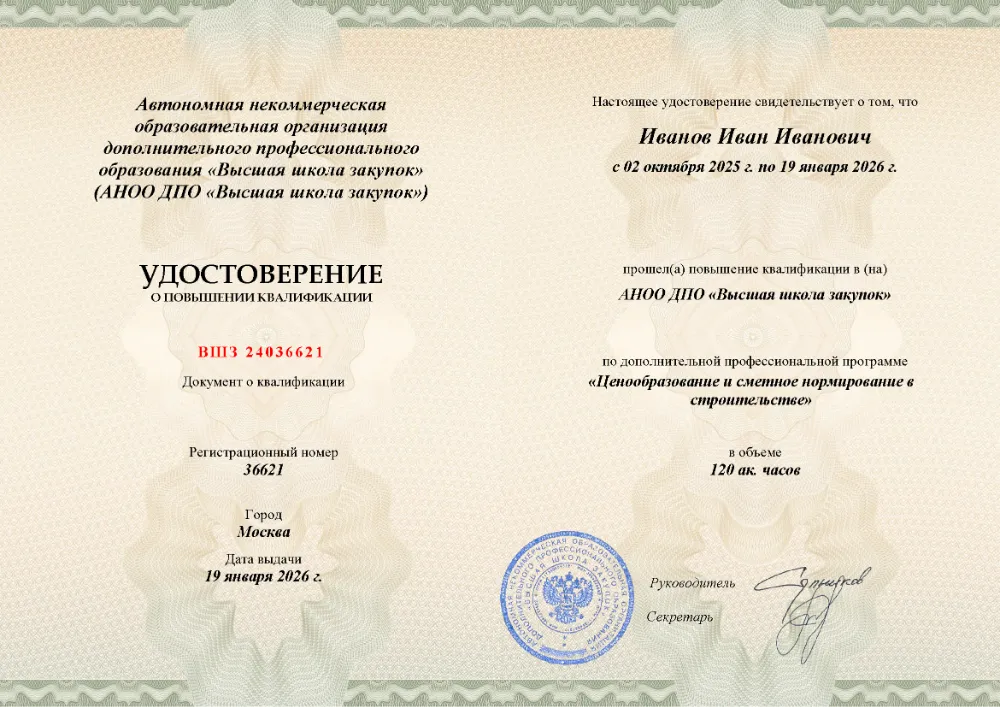 Повышение квалификации, 120 академических часов, 7 модулей: современное ценообразование и нормативная база, сметно-нормативные базы в строительстве, экономика сметной стоимости, определение стоимости ресурсов и конъюнктурный анализ, особенности расчёта стоимости монтажа и пусконаладочных работ, практическое составление смет в MS Excel, работа в программе «ГРАНД-Смета». Онлайн-обучение в в Омске с итоговой аттестацией.
