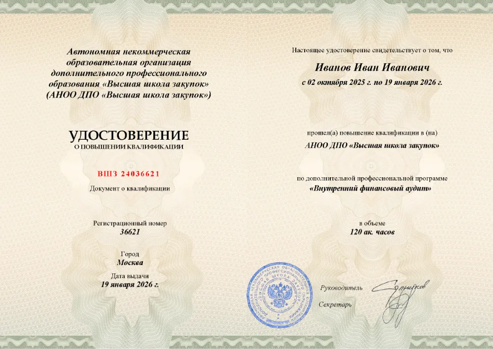 Повышение квалификации, 108 академических часов, 6 модулей: понятие, органы и стандарты внутреннего финансового контроля, планирование и организация контрольных мероприятий, процедуры оценки рисков, мониторинг и аудит в сфере закупок. Онлайн-обучение в в Омске с итоговой аттестацией.