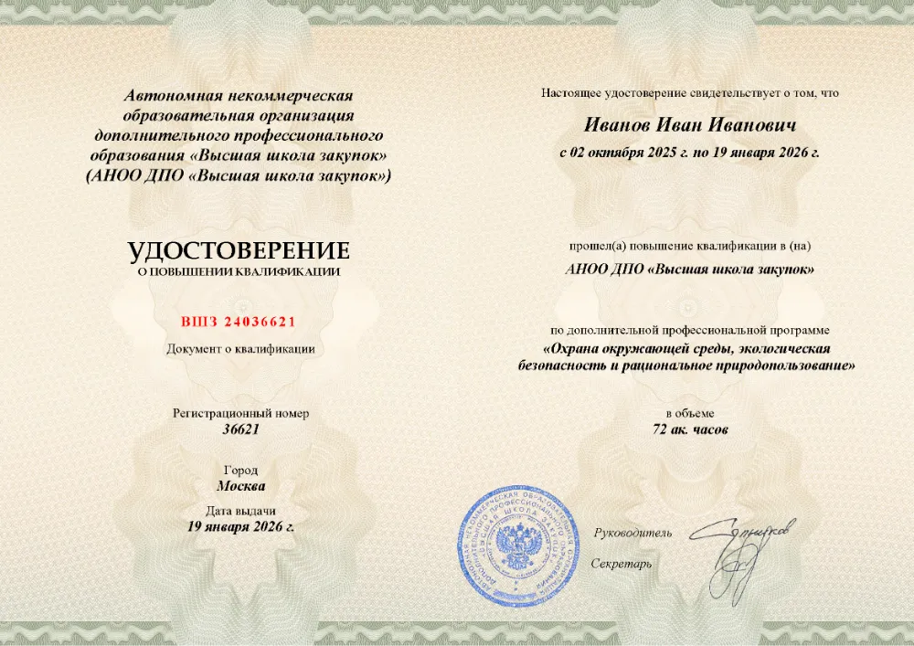 Повышение квалификации, 72 академических часа, 9 модулей: правовые основы и государственное управление в области экологии, производственный экологический контроль, документирование деятельности, система экологического менеджмента (ISO 14001) и ответственность за нарушения. Онлайн-обучение в в Омске с итоговой аттестацией.