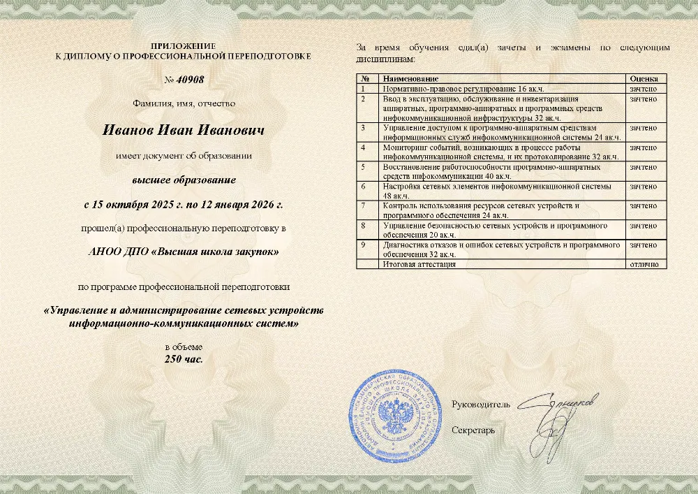 Профессиональная переподготовка, 250 академических часов, 9 модулей: нормативно-правовое регулирование и ввод в эксплуатацию, настройка и мониторинг сетевых устройств, управление доступом и безопасностью, диагностика и восстановление работоспособности инфокоммуникационных систем. Онлайн-обучение в в Омске с итоговой аттестацией.