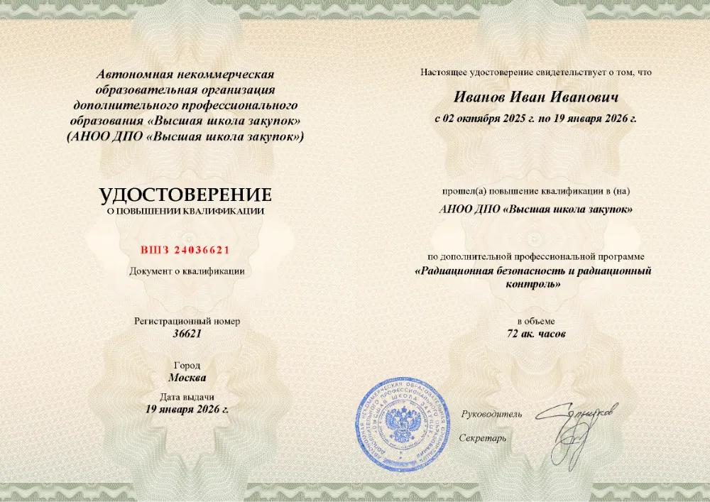 Повышение квалификации, 72 академических часа, 9 модулей: законодательное и нормативное обеспечение, дозиметрия и приборная база, лицензирование, методики радиационной защиты при эксплуатации и обслуживании установок, действия при авариях и ЧС. Онлайн-обучение в в Омске с итоговой аттестацией.